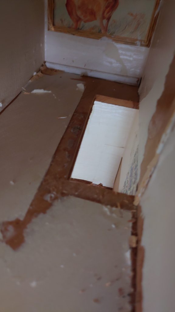 The staircase is definitely gone and not coming back! I did measure a template round the hole left behind which turned out to be an odd shape and not rectangular! I’m going to leave this for now until I get to the two rooms affected as I will be putting in new floors and ceilings so may not need to do much to fill the gap!